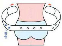 左右の腰骨より下位にボタンの位置がくるように左右対称に正しく装着してください 標準パターン@ と 標準パターンA の他に 脚・腰の状態によっては、マジックテープの前締めを、後ろ締めに替えたり、また青ボタンの位置を右腰に移して行ったり、これを合わせますと、8通りの使い方 のパターンがあります。